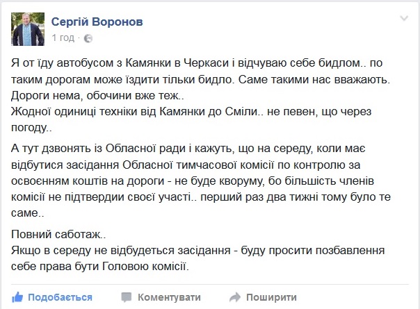 Депутат Черкаської облради від «Свободи» Сергій Воронов обурюється через стан доріг в області. Депутату через виконання своїх обов’язків доводиться долати дорогу від Кам’янки до Черкас, яка далеко не в кращому стані. Як, втім, і дисципліна серед депутатів…