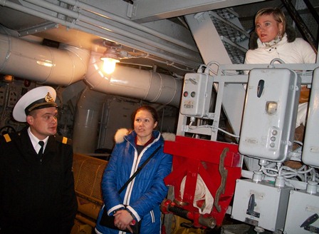 Потім моряки запросили гостей на екскурсію по катеру. Сміляни оглянули каюти й кубрики, побували на камбузі та відвідали гальюн, спускалися та піднімалися вузькими трапами, дізналися, що таке «ніс» і «ют» корабля, спробували себе в ролі штурвального в штурманській рубці, заглянули до мотористів та намагалися підняти якір.