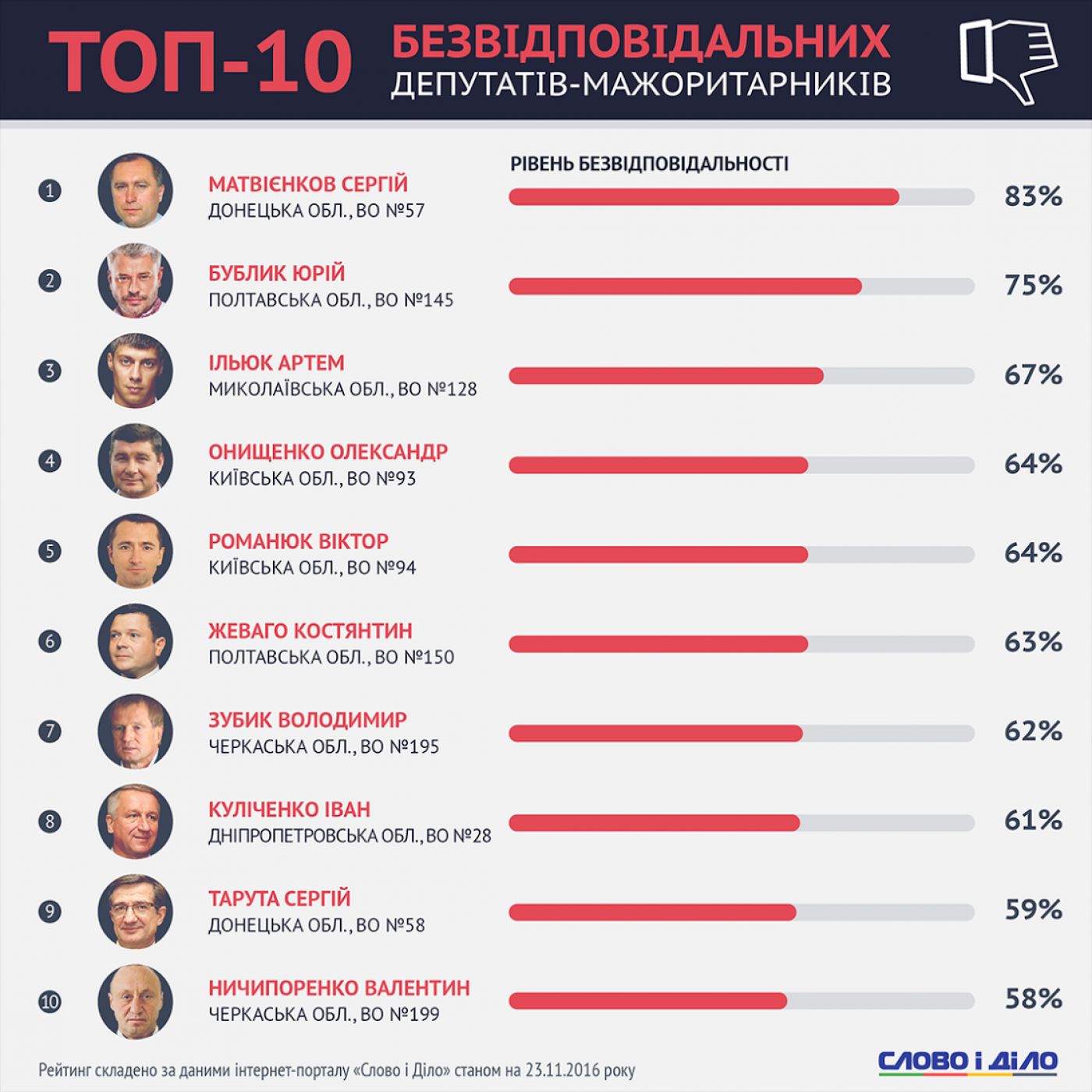 Напередодні другої річниці роботи нинішнього скликання Верховної Ради України «Слово і Діло» вирішило скласти рейтинг топ-10 найвідповідальніших і найбезвідповідальніших народних депутатів, обраних за мажоритарними округами.