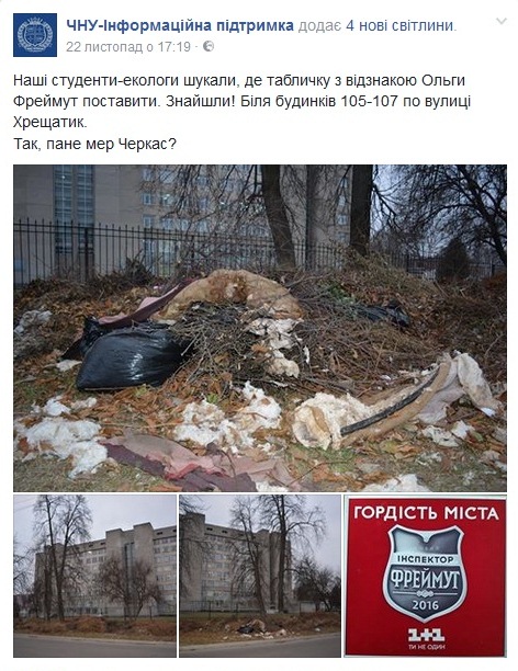 «Наші студенти-екологи шукали, де табличку з відзнакою Ольги Фреймут поставити. Знайшли! Біля будинків 105-107 по вулиці Хрещатик. Так, пане мер Черкас?», - написали вони у Фейсбуці.