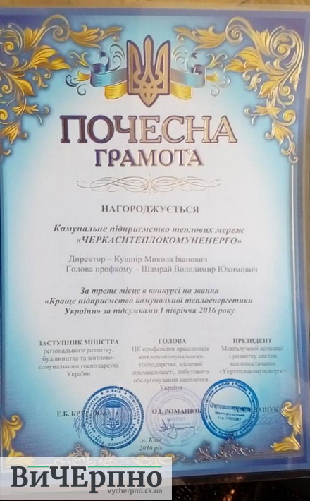 Черкаське комунальне підприємство Теплокомуненрго по сіло третє місце у всеукраїнському конкурсі на краще підприємство.