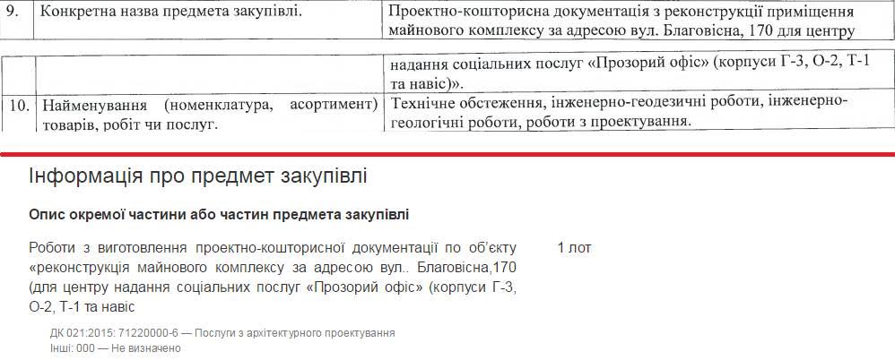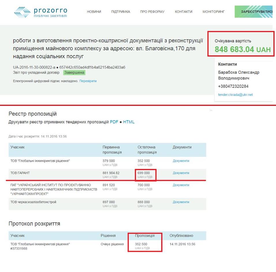 «Орієнтовна вартість робіт – 900 тис. грн. Переможець аукціону ТОВ "Глобальні інжинірингові рішення" дав ціну 352,5 тис. грн, учасник ТОВ "Гарант" на цьому ж аукціоні дав ціну 699 тис. грн, стартуючи з 882 тис. грн. В результаті торги відмінили по причині "відсутності подальшої потреби", – написав пан Чемерис. – Ну а 30 листопада в системі оприлюднили звіт про укладений договір на виготовлення цієї ПКД вартістю 848,7 тис. грн (!!!). Виконавець – ТОВ "Гарант"».