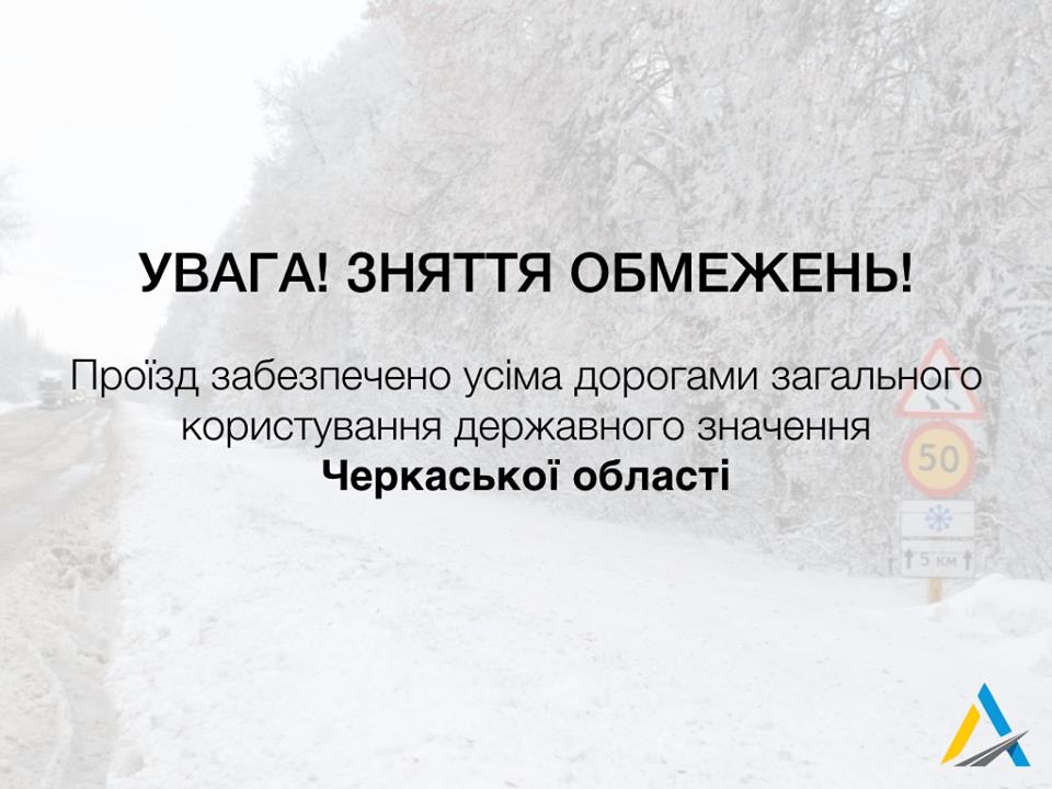 У зв’язку з покращенням погодних умов, з 8 години 9 грудня Службою автомобільних доріг у Черкаській області прийнято рішення про зняття обмеження руху пасажирського, великовагового та великогабаритного автомобільного транспорту на всіх автомобільних дорогах загального користування у Черкаській області.