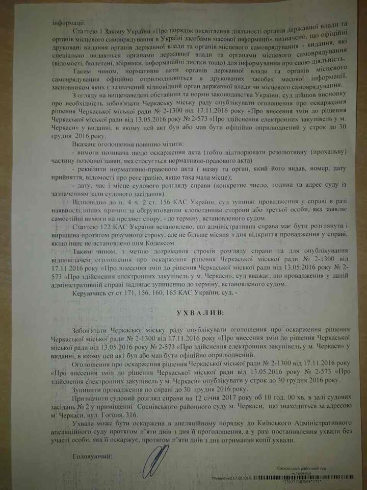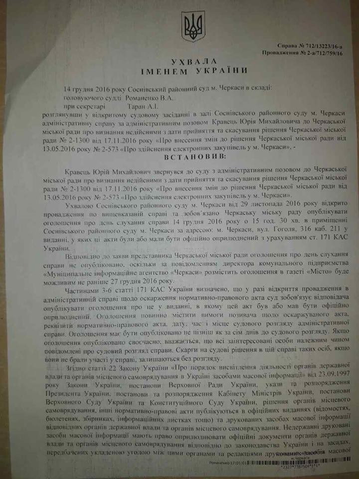 «Ухвалою суду від 29.11.2016 р. було зобов’язано міську раду опублікувати оголошення про день та час розгляду справи, для можливості прийняття в ній участь всім зацікавленим сторонам. Однак, як вбачається із заяви представника Черкаської міської ради, ухвала суду не виконана, оголошення не опубліковано, оскільки КП «Муніципальне інформаційне агенство «Черкаси» може розмістити оголошення в газеті «Місто» не раніше 27 грудня.