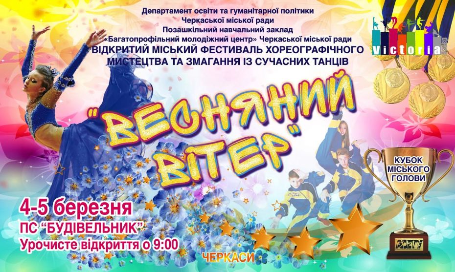 4 – 5 березня у приміщенні ПС «Будівельник» у Черкасах відбудеться Відкритий міський фестиваль хореографічного мистецтва та змагання із сучасних танців «Весняний вітер». У рамках фестивалю розігрується Кубок Міського голови.