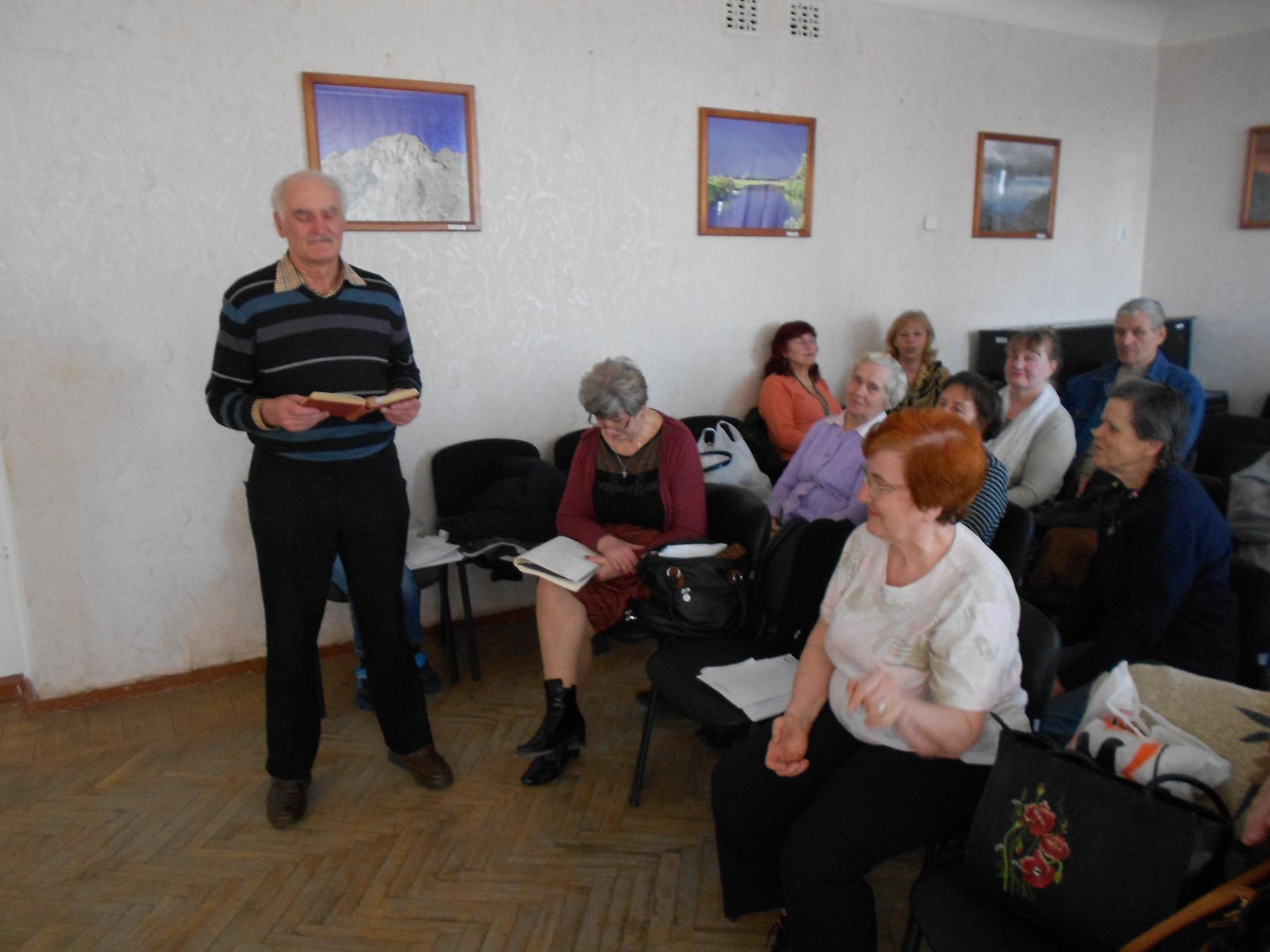 Учасники зустрічі зазначили, що поезія є відображенням і дзеркалом суспільства, вона допомагає жити. Присутні із задоволенням читали улюблені рядки поезії. Це були вірші класиків і сучасників, власні вірші учасників зустрічі. Світлана Борисівна Пушкаренко прочитала вічні цитати великого поета Омара Хайяма –мудрість, яка дійшла до нас через століття. Перехопило подих, стиснуло горло Вадиму Трохимовичу Федорину коли він читав вірш Володимира Сосюри «Любіть Україну». Присутні добре зрозуміли хвилювання Володимира Трохимовича, який під час Другої світової війни чотирирічним хлопчиком разом із бабусею був вивезений до Німеччини. Катерина Григорівна Бобровник підтримала і дочитала вірш.