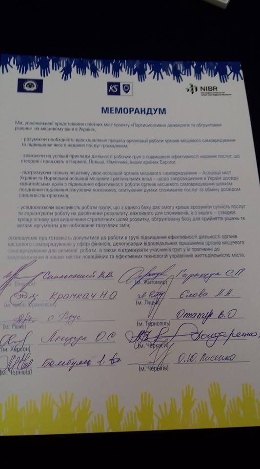 У меморандумі йдеться про готовність міст долучитись до роботи в групі підвищення ефективності діяльності органів місцевого самоврядування у сфері фінансів, делегувавши відповідальних працівників органів місцевого самоврядування для активної роботи.