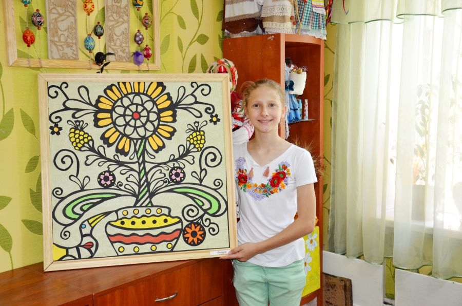 − Дочка в студії займається з другого класу. Ми її в це приміщення водили на танці. Оля кілька років бачила, як у сусідній кімнаті діти ліплять із глини, малюють, щось вирізають, роблять ляльки-мотанки. Захотіла й собі спробувати. Перші дні я сиділа поряд і допомагала. Мені сподобалося, що Галина Володимирівна дозволяє батькам бути поруч і навіть сама запрошує. Якщо ліплять із глини, то дитині треба допомогти її розім’яти. Оля ліпила маленьких звіряток, потім їх розмальовувала. На Різдвяні свята робила різні композиції колядників. У неї є дуже гарне панно «Жив-був пес». На якомусь конкурсі було найкращим. Воно розміщене в приймальні голови ЧОДА з іншими дитячими роботами цієї студії. Але найбільше їй подобається витинанка і мотанки. Думаю, що здібності фантазувати Оля перейняла від усіх жінок нашого роду. Я вмію шити, прабабусі Олі дуже гарно вишивали, а по чоловіковій ліній бабуся сама розробляла малюнки для килимів. Коли Оля готувалася до виставок, то багато працювала, недосипала. Стипендію Президента витрачатиме лише на свої потреби. Вона в нас не транжира, вміє економити. Заощаджує з кишенькових грошей, складає ті, що їй дарують на день народження чи свята. Витрачає їх на матеріали для творчості або поїздки на виставки і змагання по фітнесу, − каже мати Олена Олександрівна і зізнається. − У неї зараз настає такий період, коли треба буде визначатися з майбутньою професією. Ми з чоловіком даємо їй повну свободу вибору. Вона ще має математичні здібності, перемагає на обласних олімпіадах. Любить інформатику і займається фітнесом. Має наполегливий характер. Хочеться, щоб Оля в майбутньому знайшла себе саме в тому, що їй приноситиме задоволення від роботи. Бо це дуже важливо для людини.