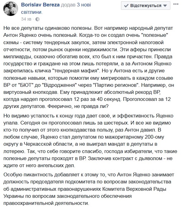 Але, мабуть, втома до кінця року дає своє, і ефективність Яценко впала. Сьогодні він проголосував лише за шістьох. І все ж, мабуть, хтось отримав від цього кнопкодавства користь, раз Антон тиснув. У будь-якому випадку, Яценко став депутатом по мажоритарному 200-ому округу в Черкаській області, а не виграв мандат в депутати в лотерею. Так, що собі говоріть спасибі, панове виборці, що такі корисні депутати проходять в ВР. Уклавши контракт з дияволом - не чекайте від нього ангельських справ», – пише Береза у «Фейсбуці».