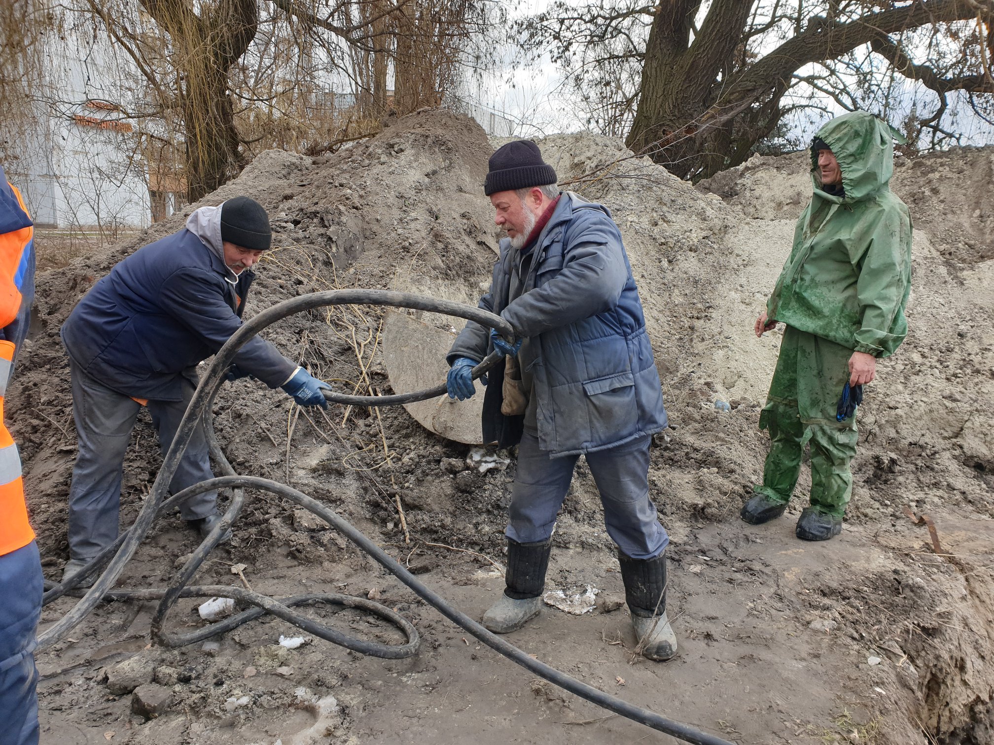 На глибині 6 метрів працівники підприємства за допомогою гідродинамічної машини виконують промивку старого трубопроводу.