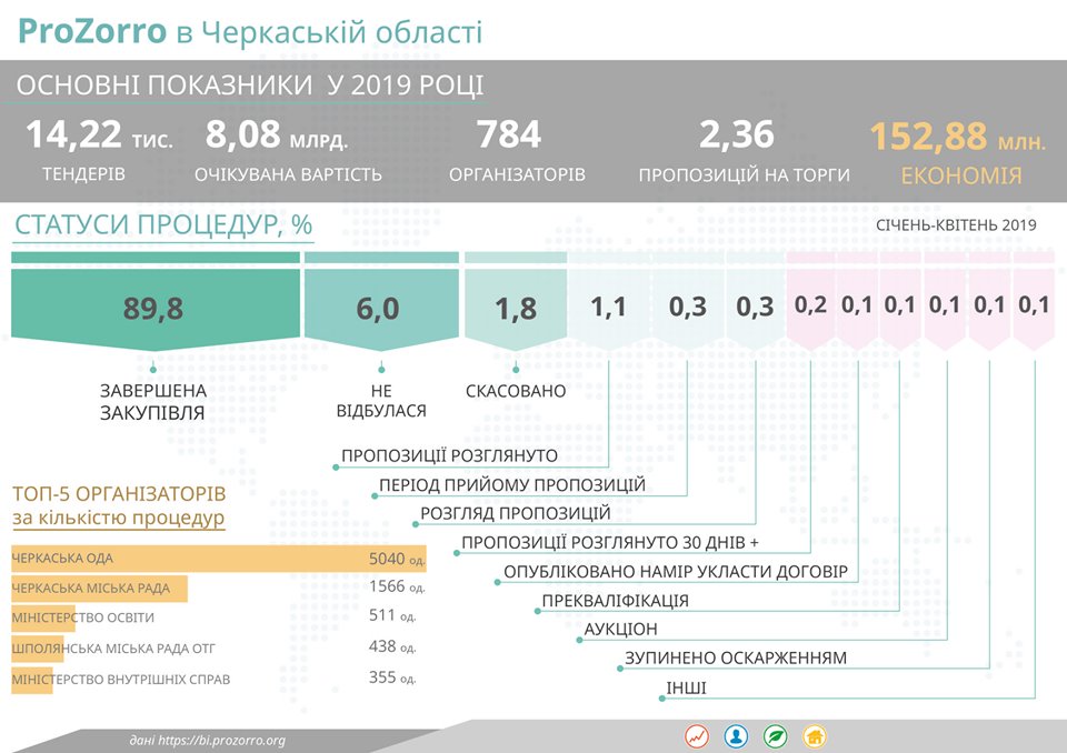Взяли участь у закупівлях 784 замовники. Економія сягає 152,88 млн грн. У загальній кількості тендерів, завершена закупівля сягає 89,8 %.