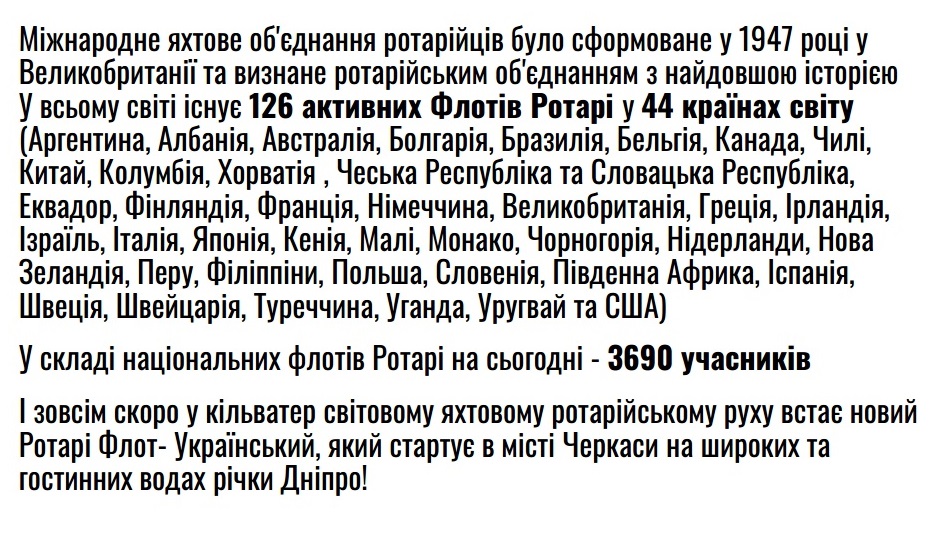 Cherkasy Ukrainian Fleet - єдиний в Україні проект, створений ротарійцями Дистрикту 2232 Украіна-Білорусь був підтриманий міжнародною Action Group яхтсменів-ротарійців International Yachting Fellowship of Rotarians (IYFR) та відомими світовими представниками вітрильного спорту.
