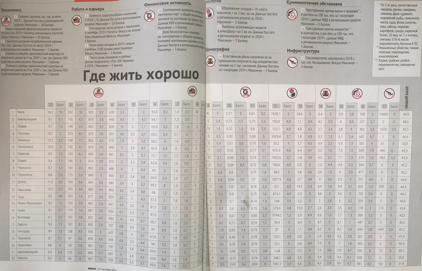У лідерах – традиційно столиця. Показники, за якими експерти видання аналізували, де все-таки в Україні жити найкраще: середня заробітна плата, інвестиційна привабливість міста, вартість умовної споживчої корзини, вартість однокімнатної квартири, вартість оренди однокімнатної квартири, зайнятість населення, співвідношення кількості резюме до вакансій, кількість шкіл, які увійшли в рейтинг «100 найкращих шкіл України», кількість вишів, які увійшли в «Топ-200 Україна», фінансова активність, екологія, демографічна ситуація, злочинність та інфраструктура.
