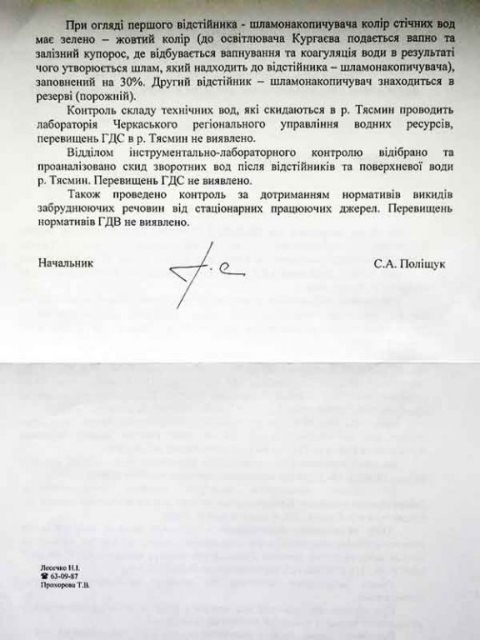 Відповідь обласної екологічної інспекції щодо забруднення Тясмину комунальним підприємством ВодГео