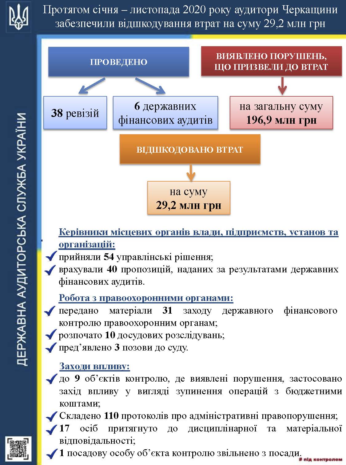 Фахівці Управління Північного офісу Держаудитслужби в Черкаській області впродовж січня – листопада 2020 року провели 38 ревізій та 6 державних фінансових аудитів. Проведеними ревізіями виявлено порушень законодавства, що призвели до втрат фінансових та матеріальних ресурсів, на суму 196,9 млн грн.