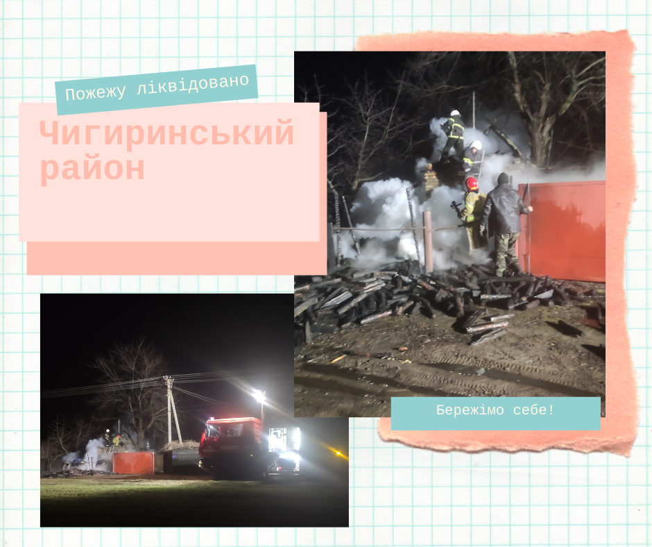 11 березня о 19:55 у селі Худоліївка Чигиринського району вогнеборці ліквідували пожежу, яка виникла в надвірній споруді 75-річного місцевого жителя.