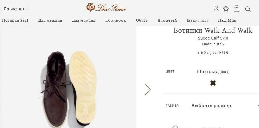 Виявилося, що це замшеве взуття відомо італійського бренду Loro Piana (Лоро П'яна). Називається модель Walk And Walk (англ. - "гуляй і гуляй"). Черевики з легким водовідштовхувальним покриттям і підкладкою з хутра нутрії. Як відзначає виробник, це ексклюзивна, незвичайно тепле взуття забезпечує комфорт в холодні зимові дні як в горах, так і в місті.