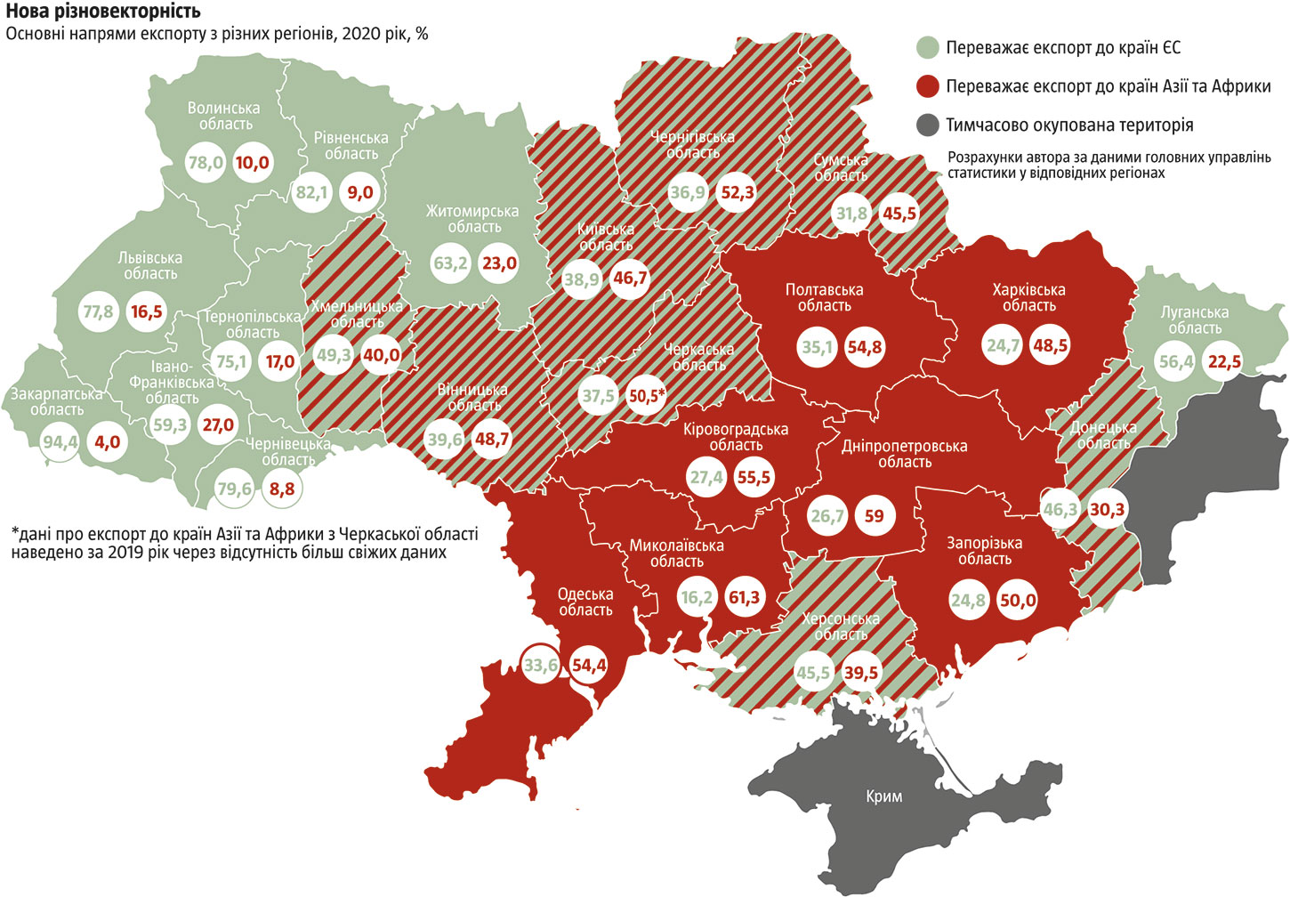 З одного боку, це група південних та прилеглих до них окремих регіонів Центральної України, де простежується тренд на деіндустріалізацію та сировинну трансформацію економіки. З кожним роком дедалі більшу роль тут відіграє експорт сільськогосподарської (зерно, насіння олійних) та промислової сировини (насамперед руди). А її поставки нарощуються переважно на ринки азійських (а також північноафриканських) країн через порти Чорного моря.