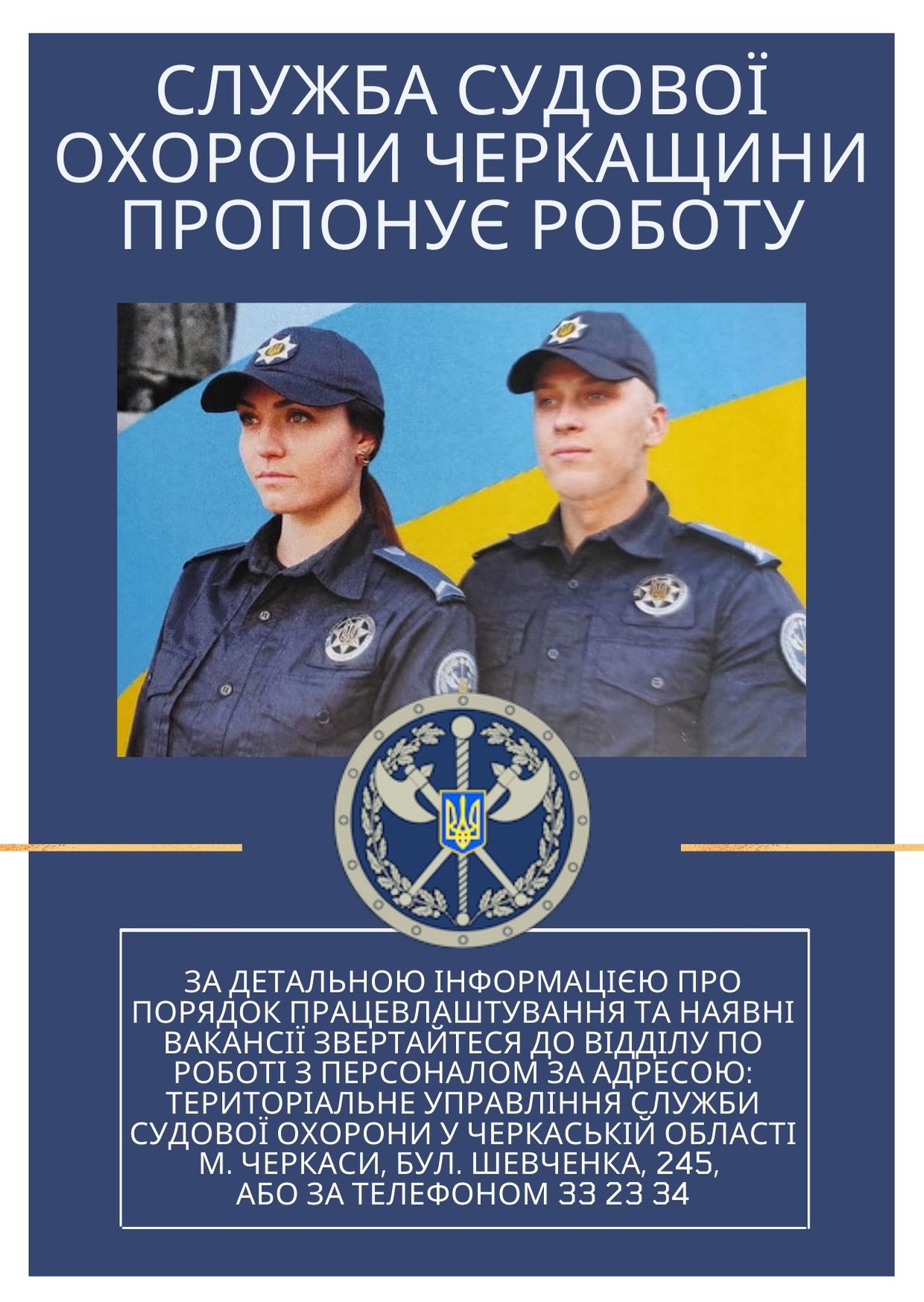 За детальною інформацією про порядок працевлаштування та наявні вакансії звертайтеся до Відділу по роботі з персоналом за адресою: Територіальне управління Служби судової охорони у Черкаській області м. Черкаси, бул. Шевченка, 245, або за телефоном 33 23 34.