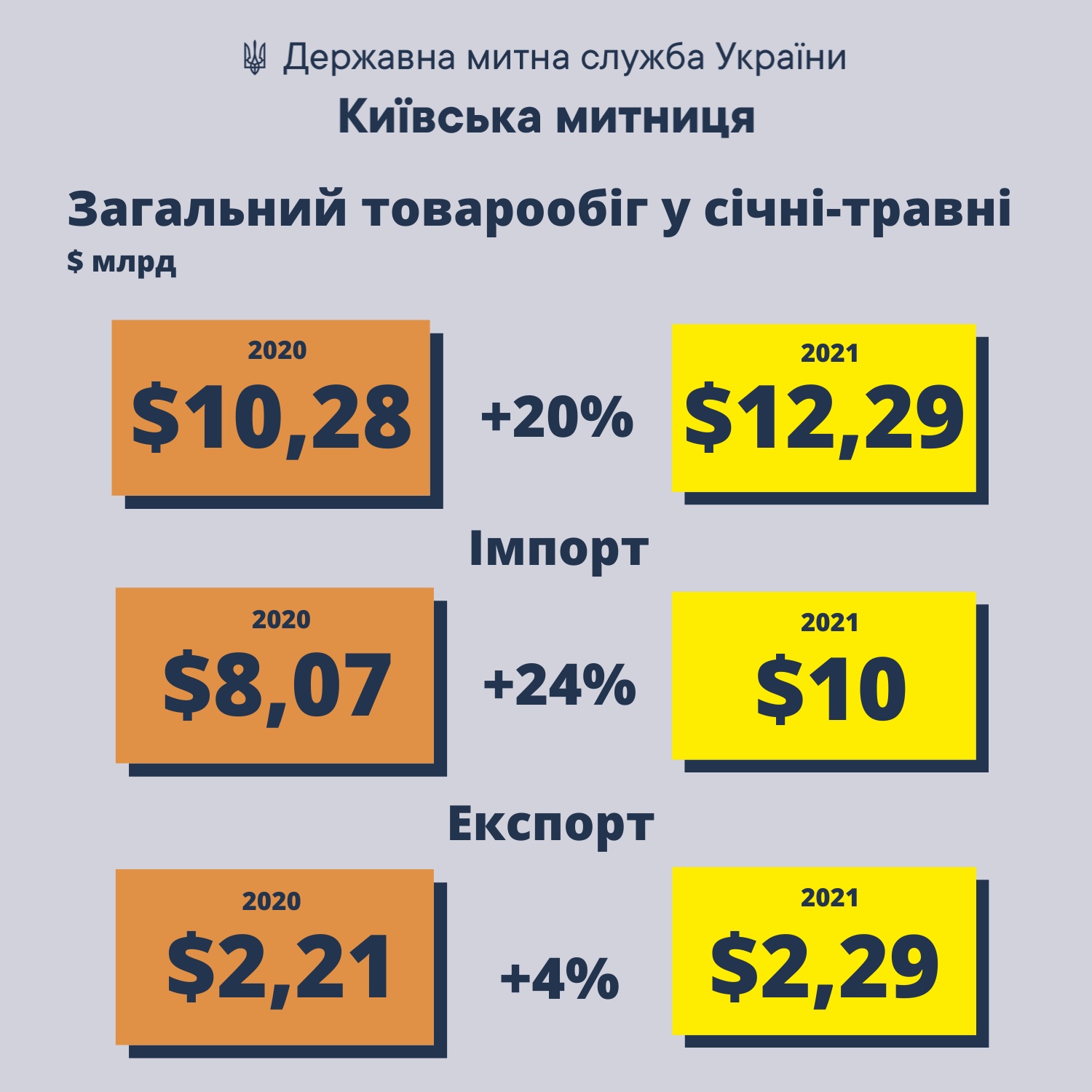 Загальний товарообіг в зоні діяльності Київської митниці Держмитслужби (столиця, Київська, Житомирська та Черкаська області) за п’ять місяців 2021 року збільшився майже на 20% та склав $12,29 млрд, що на $2,01 млрд більше, ніж за аналогічний період минулого року (у 2020 році – $10,28 млрд).