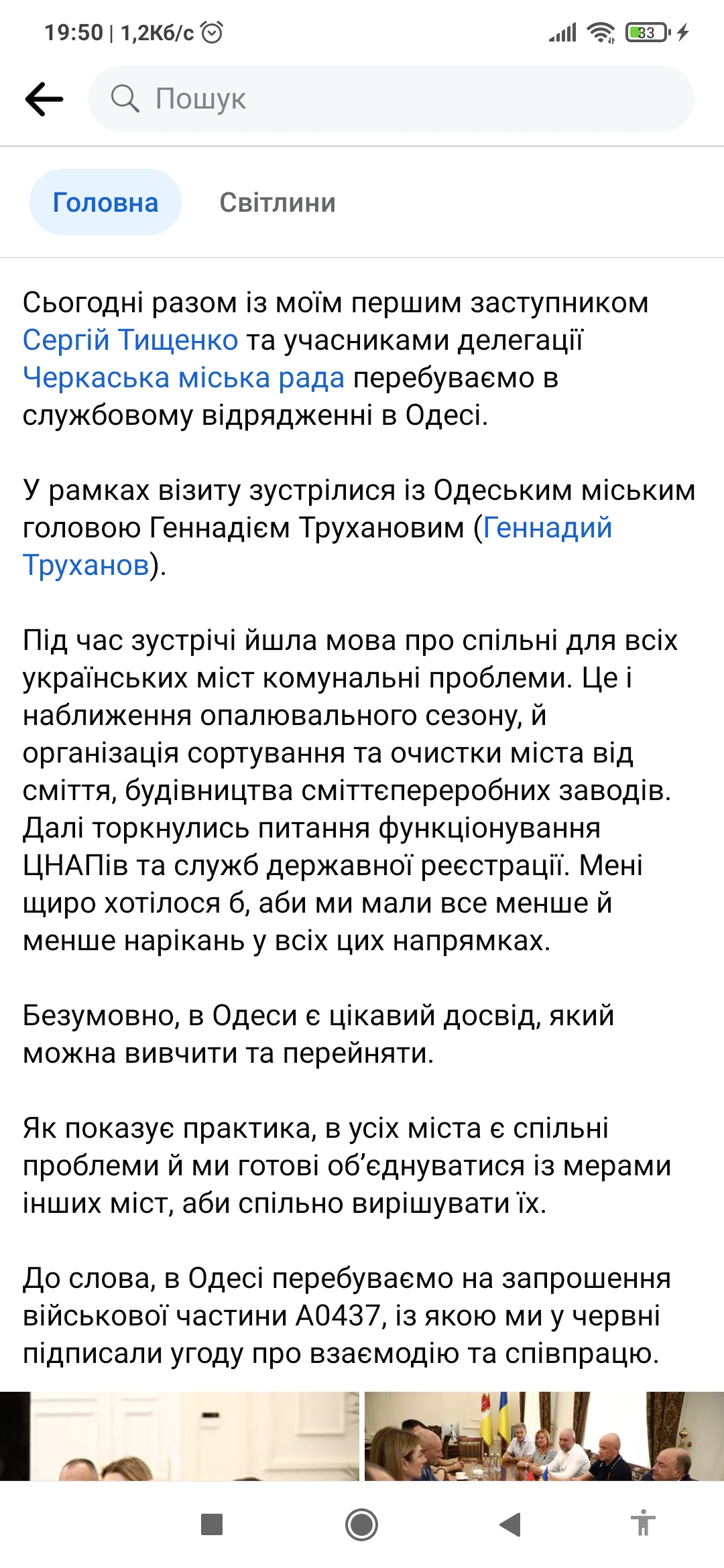 "Під час зустрічі йшла мова про спільні для всіх українських міст комунальні проблеми. Це і наближення опалювального сезону, й організація сортування та очистки міста від сміття, будівництва сміттєпереробних заводів. Далі торкнулись питання функціонування ЦНАПів та служб державної реєстрації. Мені щиро хотілося б, аби ми мали все менше й менше нарікань у всіх цих напрямках. До слова, в Одесі перебуваємо на запрошення військової частини А0437, із якою ми у червні підписали угоду про взаємодію та співпрацю"