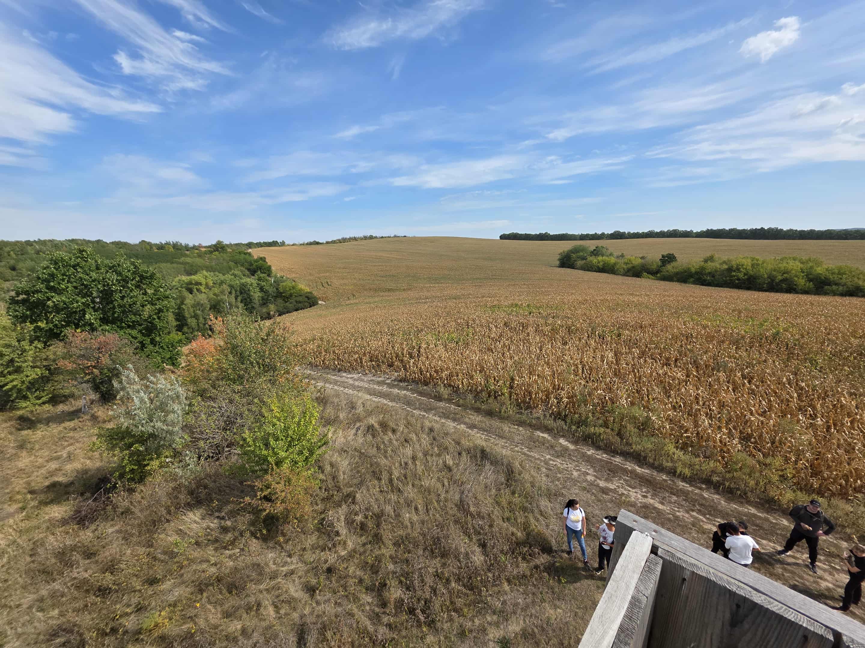 Далі, піднявшись з яру в бік поля, зупиняються біля оглядової вежі. Звідси відкривається чудовий краєвид. Одні вважають, що це місце охоронців кукурудзяного поля, інші — що мисливців на кабанів.