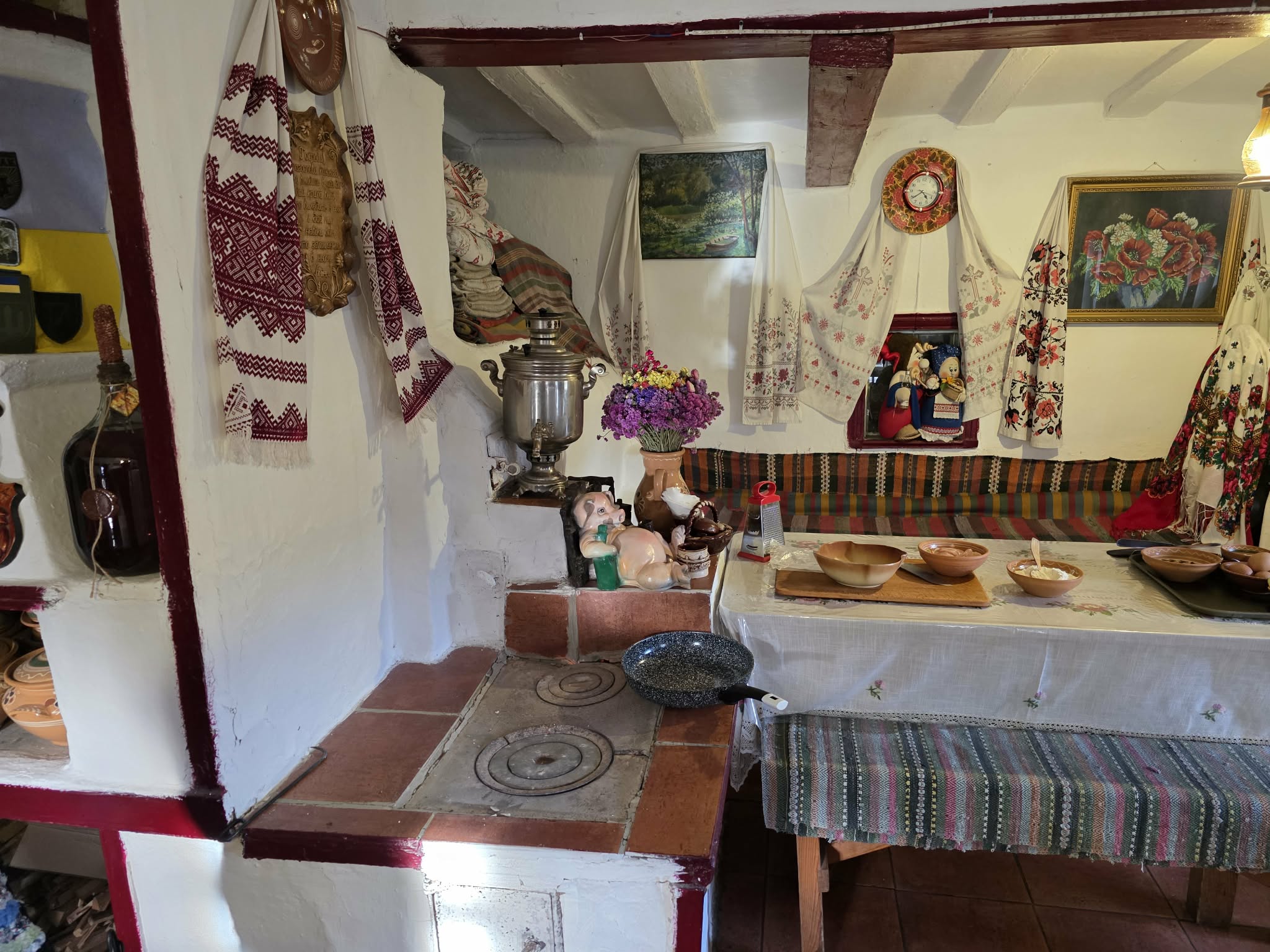 «Класична хата на дві половини — це панська хата. Колись тут була величезна піч, але згодом її прибрали, щоб звільнити простір для гостей», — показує господиня, показуючи приміщення з глиняним посудом, старими мисниками та реманентом.