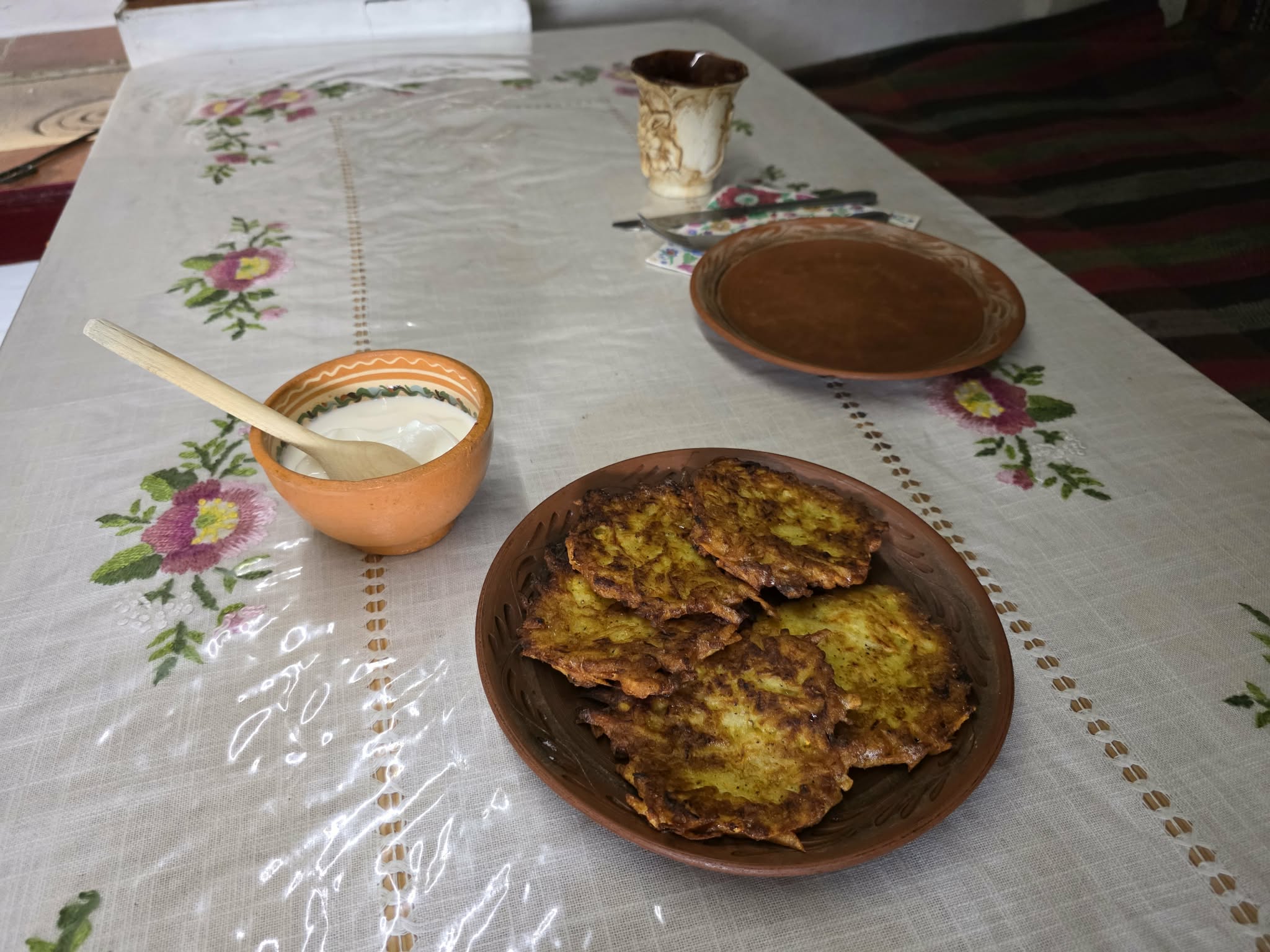 «Секрет хрустких дерунів — робити тісто лише на одну порцію, щоб не пускало сік», — пояснює господиня, натираючи картоплю на крупну тертку.