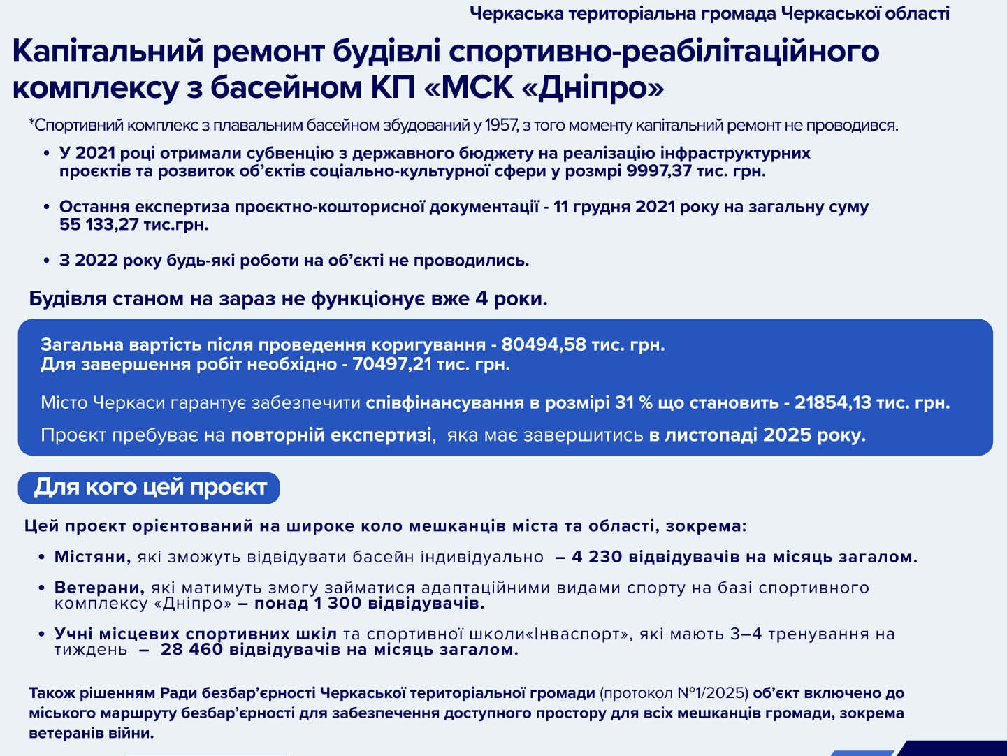 Сьогодні просто в центрі Черкас стоїть «заморожена» недореконструйована будівля комунального басейну «Дніпро». На паркані подерта вивіска нагадує часи до повномасштабного вторгнення, коли впроваджувалася державна програма «Велике будівництво». Саме в рамках цієї програми і починалася його реконструкція кілька років тому. Але війна все зупинила.